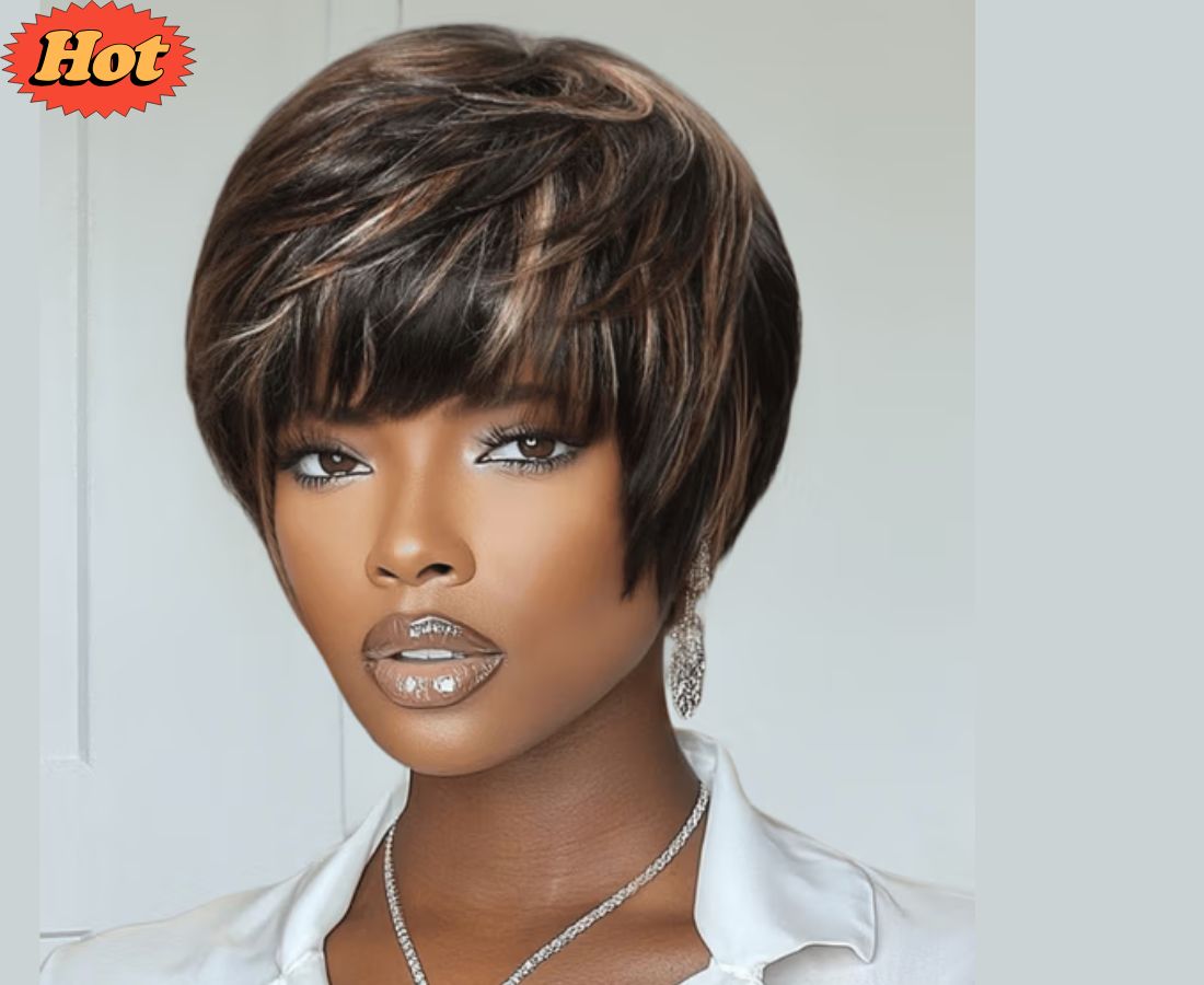 Short Pixie Cut Wig Brazilian Virgin Human Hair Black And Highlight Colorful Wig with Bangs Full Machine Ready To Go Glueless Wig