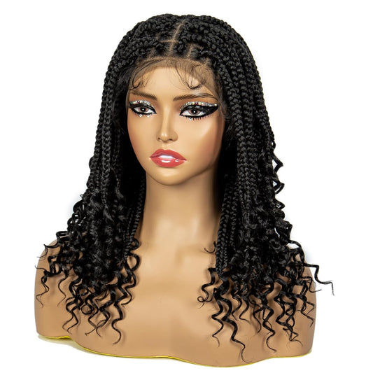 ShowReal 16 Inch Synthetic Full Lace Knotless Braided Wigs with Curly Ends for Black Women Handmade Braiding Wigs with Baby Hair Synthetic Braid Hair Gorgeous Fluffy Wigs with Baby Hair Bangs Synthetic Braided Full Lace Wigs