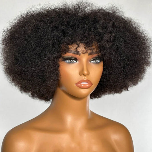 ShowReal Afro Kinky Curly Human Hair Wig with Bangs Full Machine Made Wig Glueless Virgin Brazilian Afro Curly Wigs for Black Women 200% Density Natural Color 12 inch 24 inch