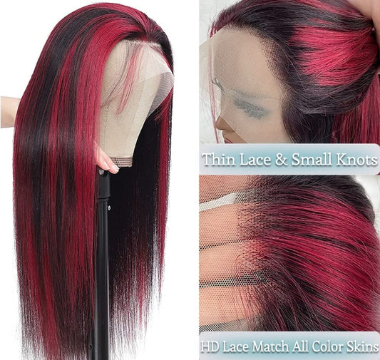 ShowReal Ombre Highlight 13x4 Straight Lace Front Wig Black And Burgundy Wig Human Hair 13x6 Hd Lace Frontal Wigs 99J Bone Straight Human Hair Wigs 180% Density
